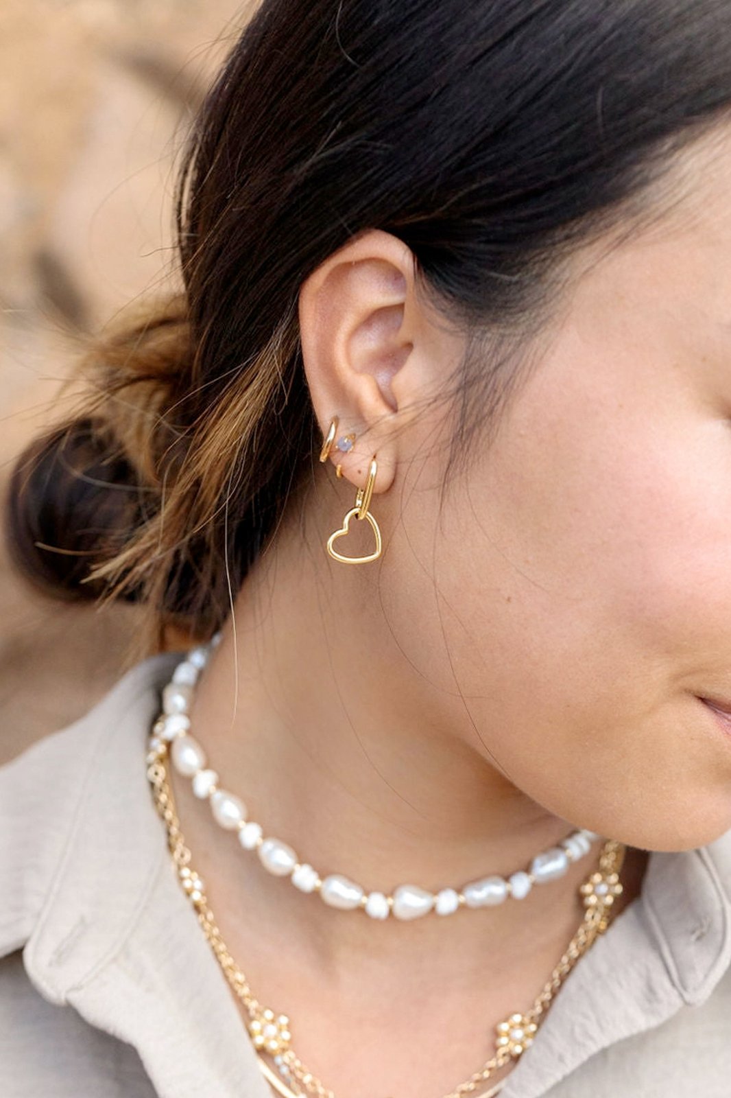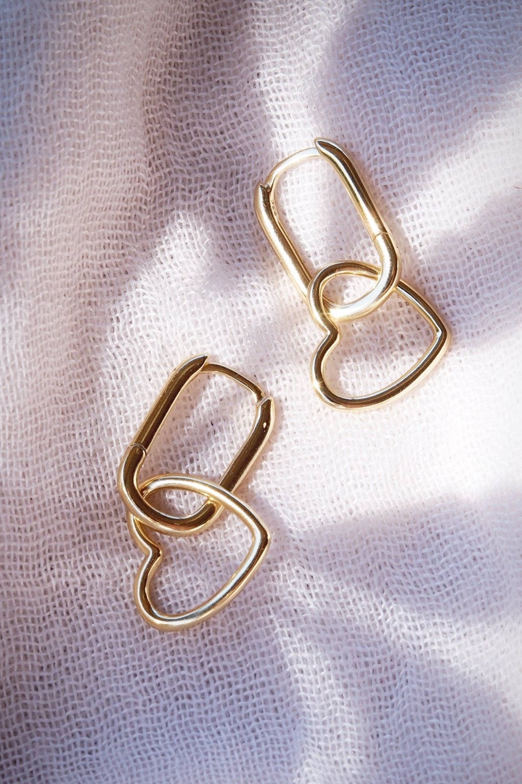 Gold elongated huggie hoops with a dangling heart. These darling gold huggie hoops are a sweet addition to your gold hoop collection. A perfect statement by themselves or stacked with other beauties.