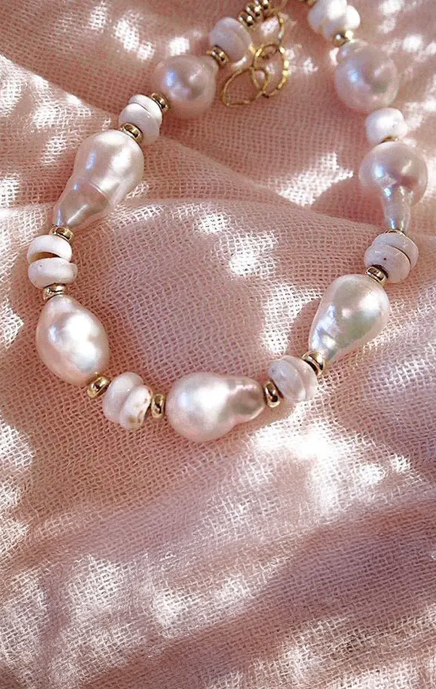 Flanked with luminescent natural white baroque pearls and puka shells, this unique luxurious bracelet evokes visions of Hawaii's white sands and soothing shores. Stack this with other beaded beauties and you'll be ready for your tropical escape.