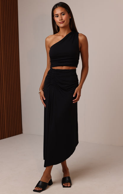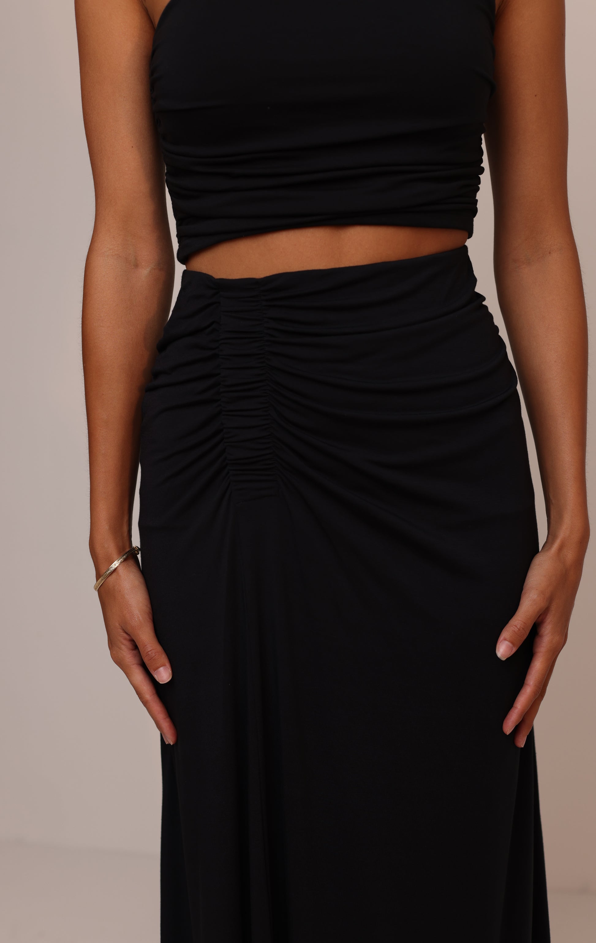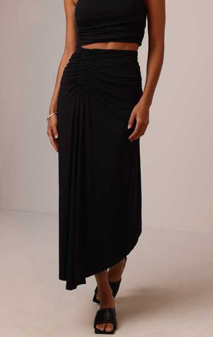 This midi skirt is crafted from our signature soft Jersey fabric that drapes beautifully with every step. Designed with a high-rise fit and gathered ruching down the front, it creates a sleek, body-skimming silhouette that’s both comfortable and polished. The asymmetrical hemline adds a modern edge, making it easy to dress up with heels or keep casual with sandals. Pair it with the matching top for a coordinated look, or mix it with your favorite basics for endless styling options.