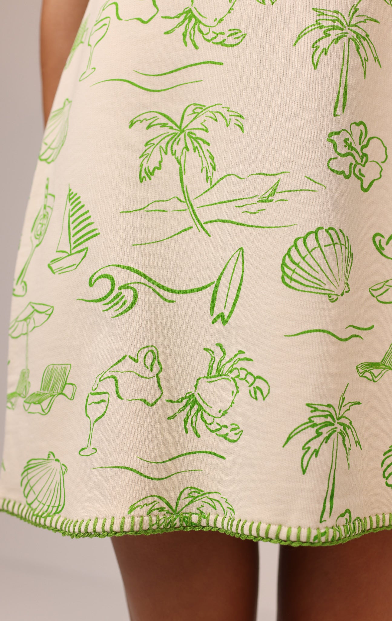 Our exclusive “Vacation” print features hand-drawn palms, shells, sailboats, beach umbrellas, and coastal details in fresh green against a neutral base.